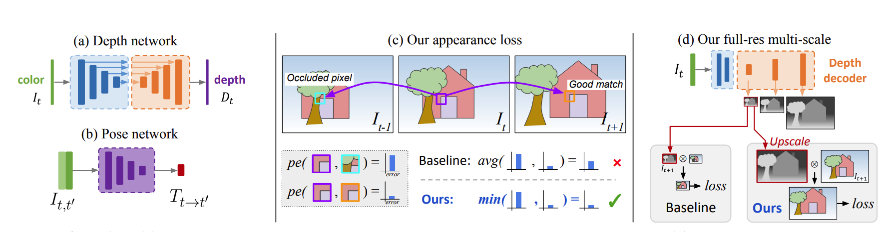 Self-Supervised Monocular Depth Estimation (Monodepth2) [Godard19] builds a simple depth model and train it with a self-supervised manner by exploiting the spatial geometry constrain. The key idea of Monodepth2 is that it builds a novel reprojection loss, include (1) a minimum reprojection loss, designed to robustly handle occlusions, (2) a full-resolution multi-scale sampling method that reduces visual artifacts, and (3) an auto-masking loss to ignore training pixels that violate camera motion assumptions.